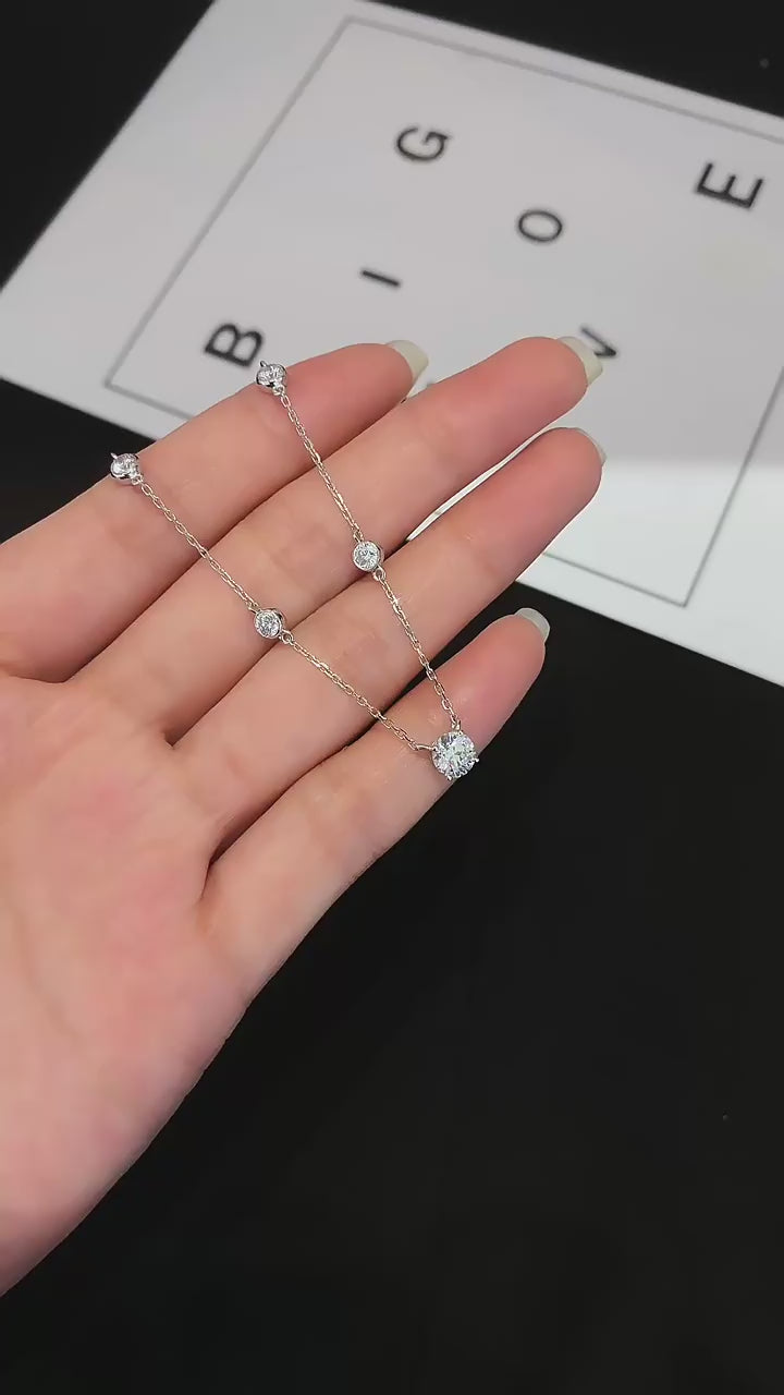 Elegant and refined, this 14K white gold necklace features a total of 1.00 carat of sparkling lab-grown diamonds. A brilliant centre stone is complemented by four bezel-set accent diamonds, evenly spaced along a delicate chain for a timeless, versatile look. Perfect for both everyday wear and special occasions, this necklace adds understated luxury to any outfit.